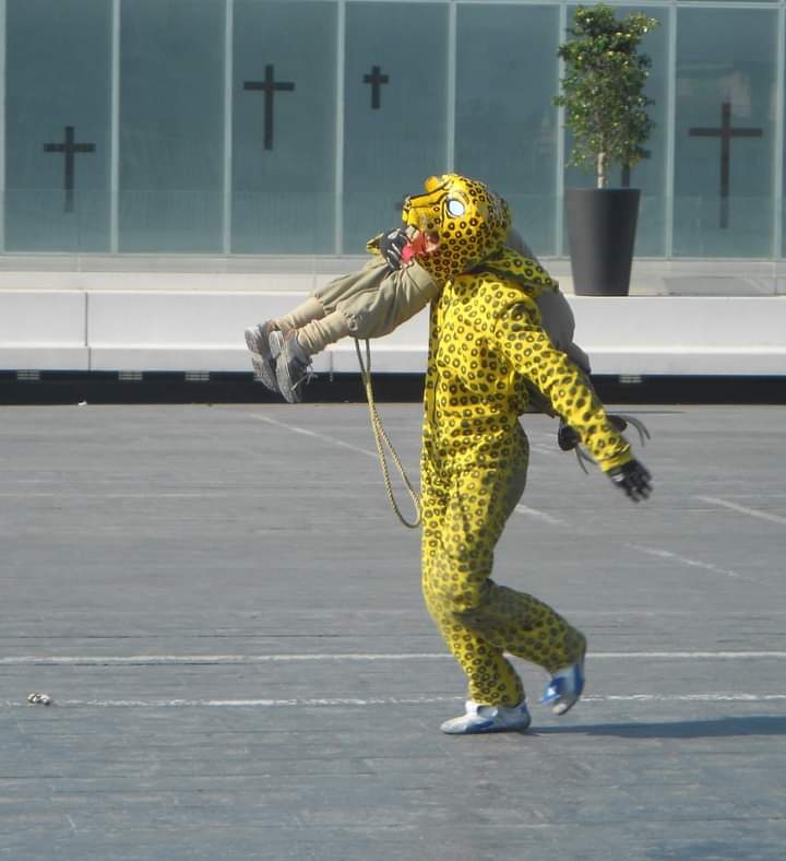 Acompañándolos de cerca, contrasta la actitud lúdica y risueña de las tradiciones de jaguares.